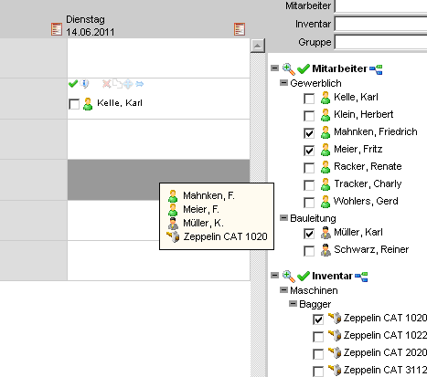 Durch das Setzen der Häkchen bei mehreren Mitarbeitern bzw. Inventaren können mehrere Mitarbeiter oder Maschinen auf gleiche Weise gleichzeitig disponiert werden.